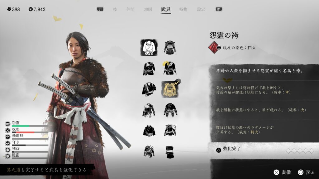 苦無に特化した護符を装備することで、苦無をポイポイ投げるだけで敵が焼け死んでいく恐怖の鎧と化す。