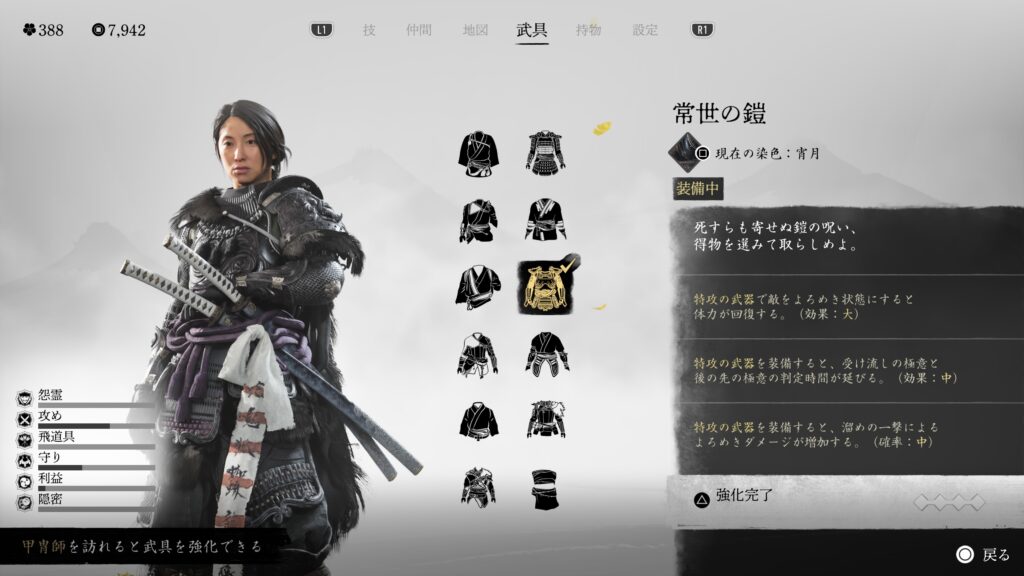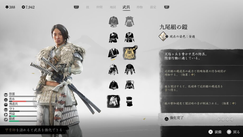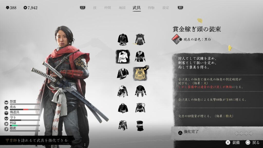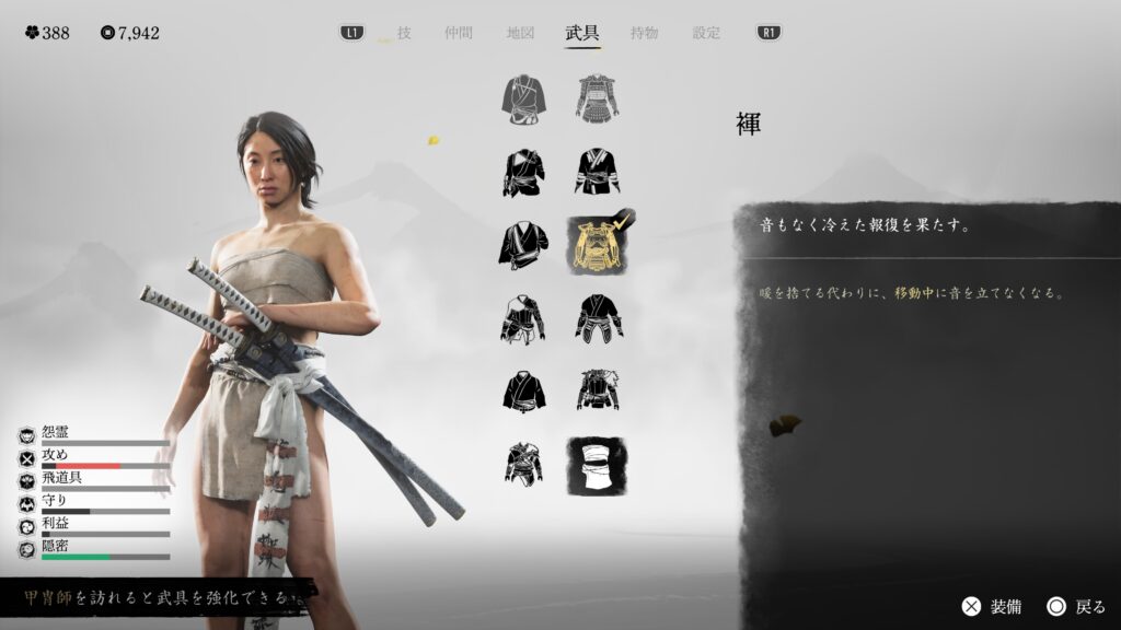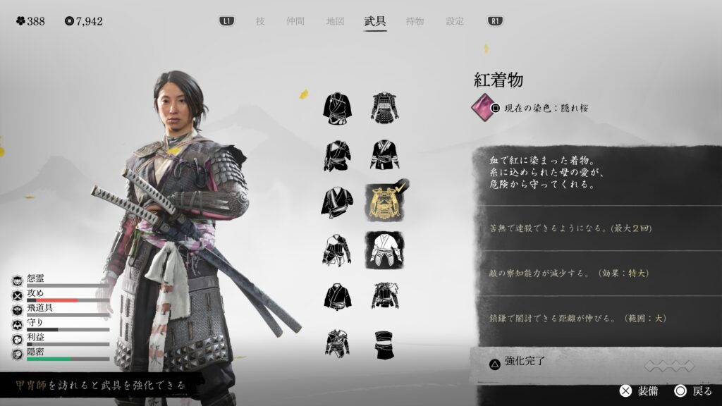 鎖鎌での闇討距離も伸びるので、とにかく闇討に特化している。戦闘用の効果は特にないので、バレて戦闘になった場合は他の鎧に着替えた方が良い。