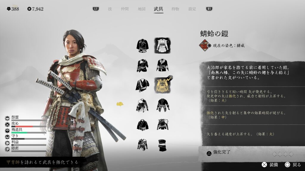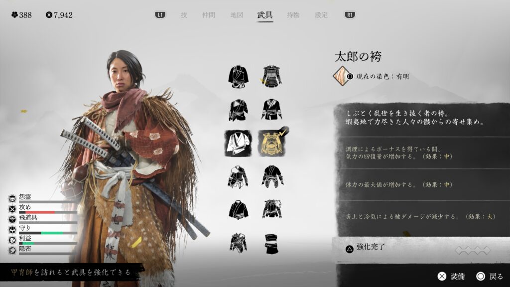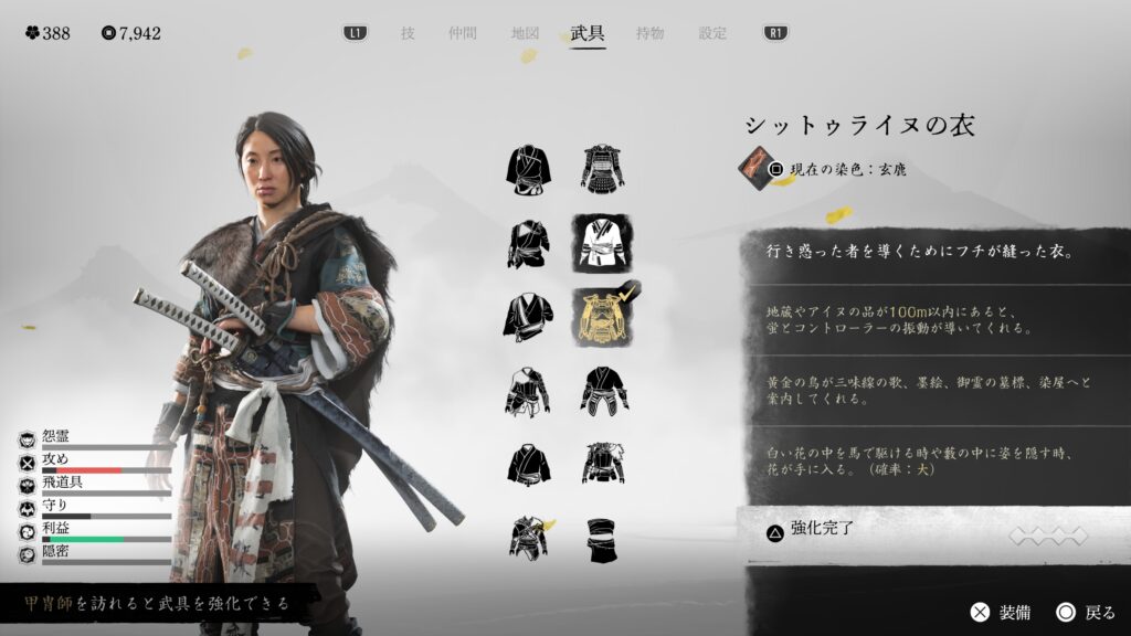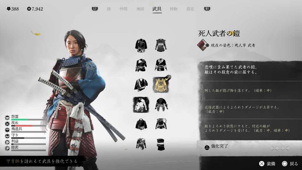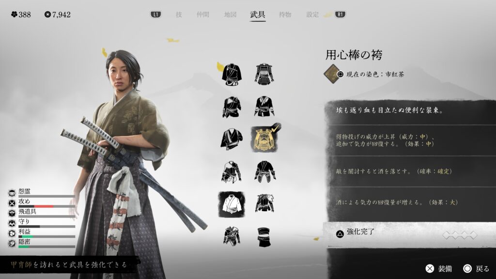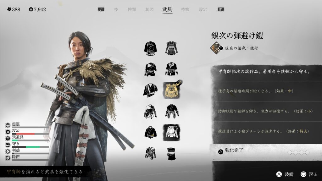 鎖鎌での闇討距離も伸びるので、とにかく闇討に特化している。戦闘用の効果は特にないので、バレて戦闘になった場合は他の鎧に着替えた方が良い。