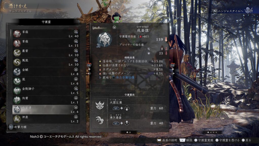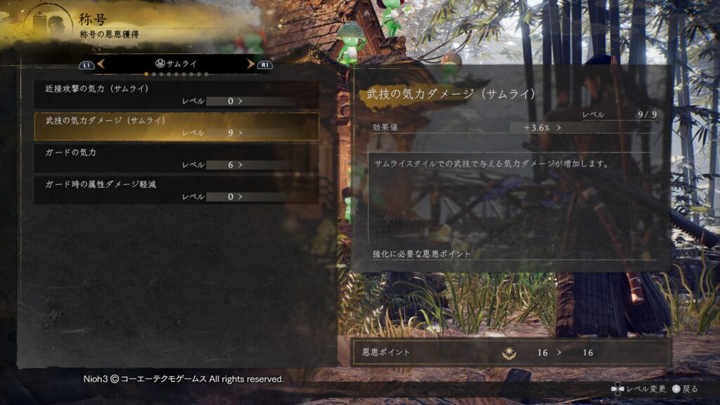 「仁王」シリーズでは、能力開花によるレベルアップ以外にも主人公のステータスに影響を及ぼす要素が多々ある。