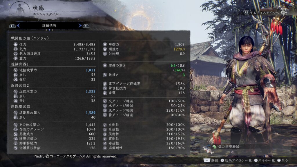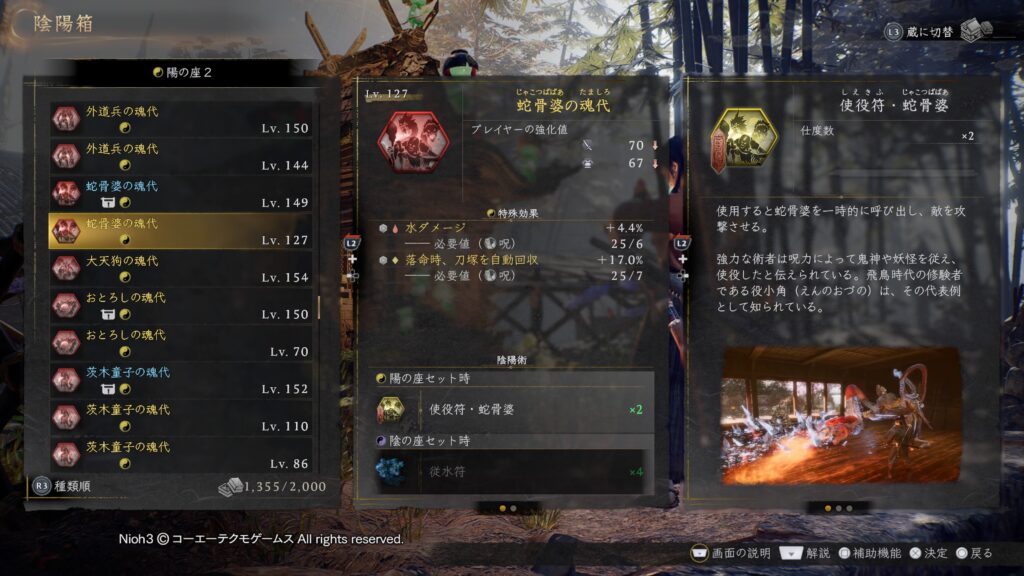 「仁王」シリーズの戦いは近接攻撃がメインだが、それをサポートするのが忍術と陰陽術だ。主に少し離れたところからの攻撃、主人公へのバフ、敵へのデバフが可能。