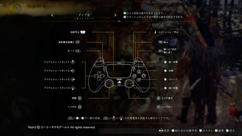しかし、全てのタイプの中でタイプBだけはこのコマンドがL1+□、L1+△になっているため、スティック操作よりは各段に暴発しづらく、また過去作でのデフォルト操作タイプと同じコマンドにもなっていて、経験者には親しみやすい。